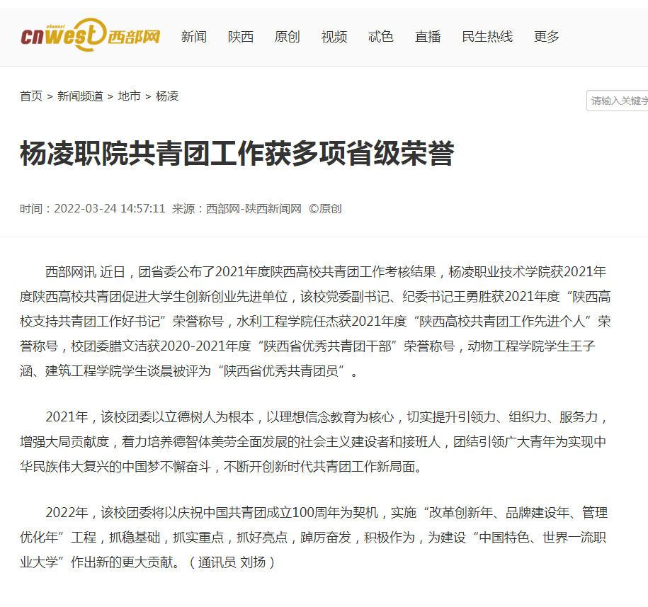 西部网讯 近日,团省委公布了2021年度陕西高校共青团工作考核结果,杨凌职业技术学院获2021年度陕西高校共青团促进大学生创新创业先进单位,该校党委副书记、纪委书记王勇胜获2021年度“陕西高校支持共青团工作好书记”荣誉称号,水利工程学院任杰获2021年度“陕西高校共青团工作先进个人”荣誉称号,校团委腊文洁获2020-2021年度“陕西省优秀共青团干部”荣誉称号,动物工程学院学生王子涵、建筑工程学院学生谈晨被评为“陕西省优秀共青团员”。