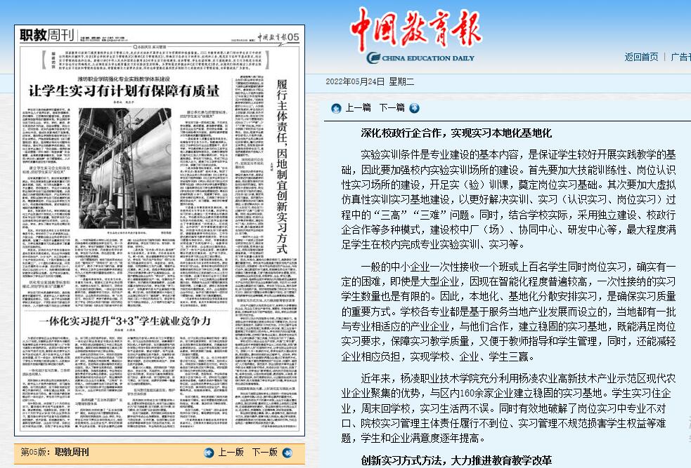 近年来,杨凌职业技术学院充分利用杨凌农业高新技术产业示范区现代农业企业聚集的优势,与区内160余家企业建立稳固的实习基地。学生实习住企业,周末回学校,实习生活两不误。同时有效地破解了岗位实习中专业不对口、院校实习管理主体责任履行不到位、实习管理不规范损害学生权益等难题,学生和企业满意度逐年提高。