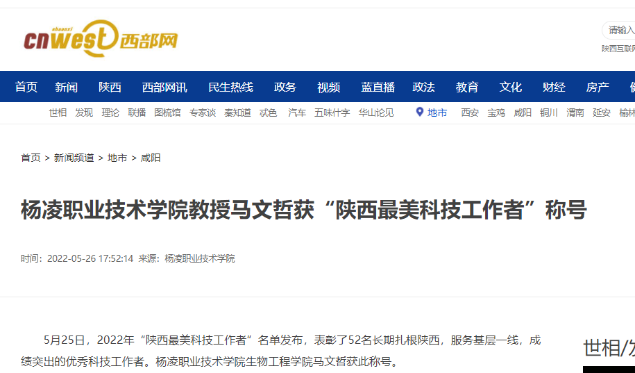 5月25日,2022年“陕西最美科技工作者”名单发布,表彰了52名长期扎根陕西,服务基层一线,成绩突出的优秀科技工作者。杨凌职业技术学院生物工程学院马文哲获此称号。