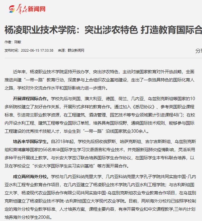 近年来,杨凌职业技术学院坚持开放办学、突出涉农特色,主动对接国家教育对外开放战略,全面推进共建“一带一路”教育行动,深度参与上合组织农业基地建设,走出了一条独具特色的国际化育人之路,学校对外交流合作水平和国际影响力进一步提升。