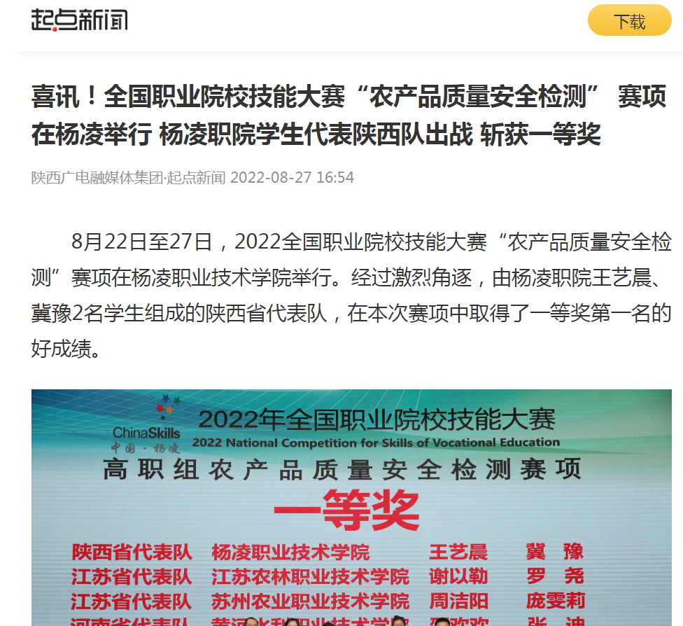 【起点新闻】喜讯!全国职业院校技能大赛“农产品质量安全检测” 赛项在杨凌举行 杨凌职院学生代表陕西队出战 斩获一等奖