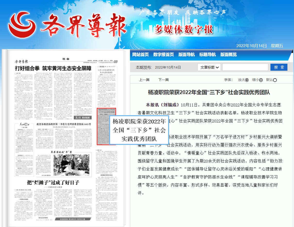 本报讯(刘福成)10月11日,共青团中央公布2022年全国大中专学生志愿者暑期文化科技卫生“三下乡”社会实践活动表彰名单,杨凌职业技术学院生物工程学院“情暖童心”社会实践团队荣获2022年全国“三下乡”社会实践优秀团队。