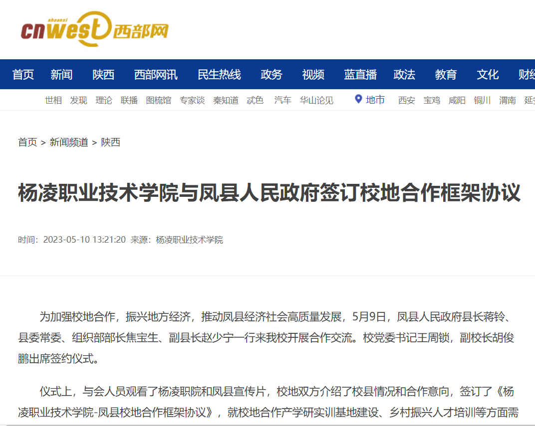 仪式上,与会人员观看了杨凌职院和凤县宣传片,校地双方介绍了校县情况和合作意向,签订了《杨凌职业技术学院-凤县校地合作框架协议》,就校地合作产学研实训基地建设、乡村振兴人才培训等方面需求开展了座谈交流。