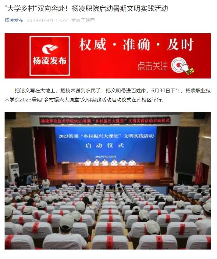 把论文写在大地上,把技术送到农民手,把文明带进百姓家。6月30日下午,杨凌职业技术学院2023暑期“乡村振兴大课堂”文明实践活动启动仪式在南校区举行。