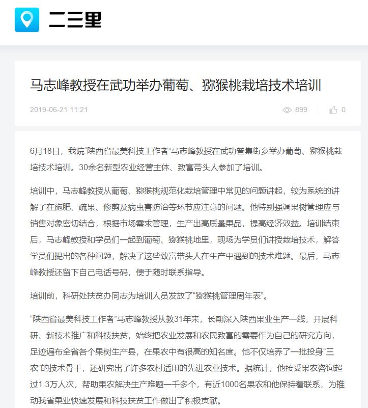 6月18日,我院“陕西省最美科技工作者”马志峰教授在武功普集街乡举办葡萄、猕猴桃栽培技术培训。30余名新型农业经营主体、致富带头人参加了培训。
