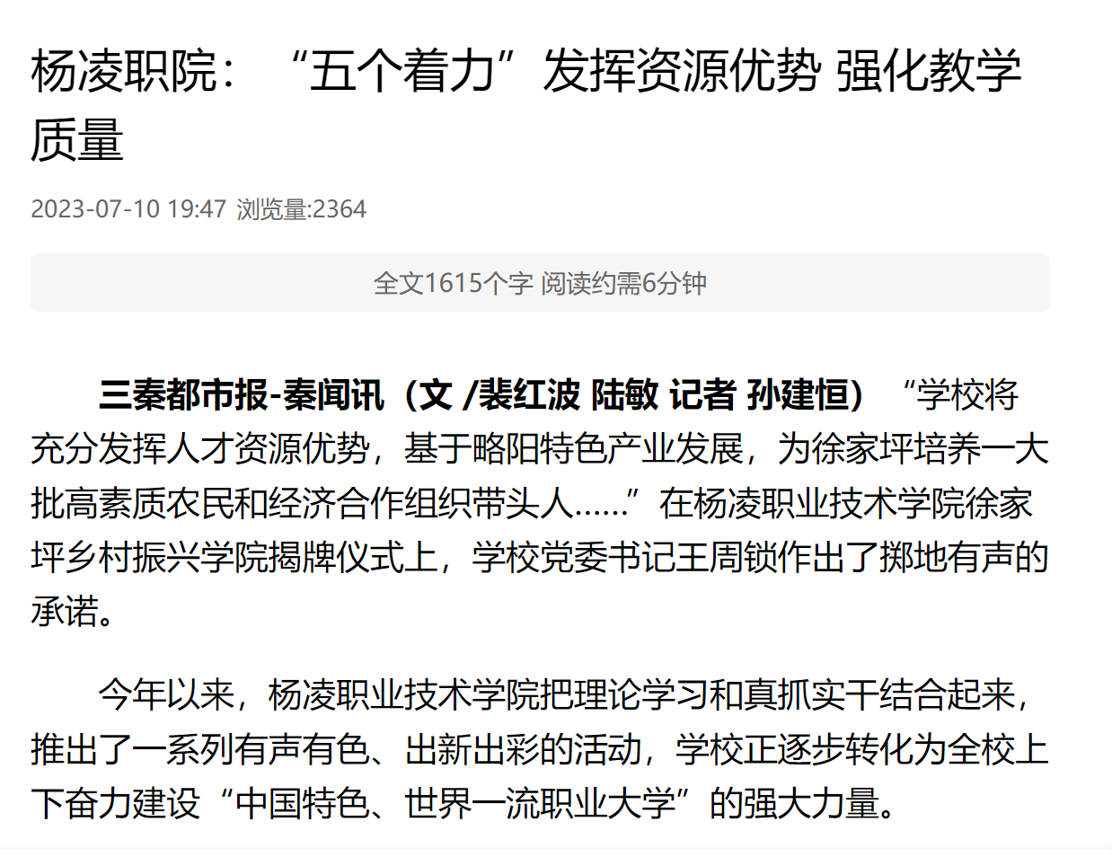 三秦都市报-秦闻讯(文 /裴红波 陆敏 记者 孙建恒)“学校将充分发挥人才资源优势,基于略阳特色产业发展,为徐家坪培养一大批高素质农民和经济合作组织带头人……”在杨凌职业技术学院徐家坪乡村振兴学院揭牌仪式上,学校党委书记王周锁作出了掷地有声的承诺。