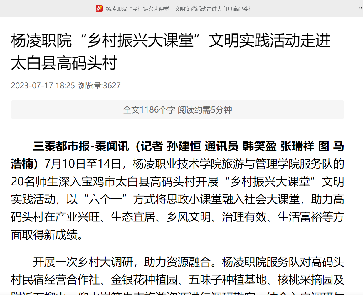 三秦都市报-秦闻讯(记者 孙建恒 通讯员 韩笑盈 张瑞祥 图 马浩楠)7月10日至14日,杨凌职业技术学院旅游与管理学院服务队的20名师生深入宝鸡市太白县高码头村开展“乡村振兴大课堂”文明实践活动,以“六个一”方式将思政小课堂融入社会大课堂,助力高码头村在产业兴旺、生态宜居、乡风文明、治理有效、生活富裕等方面取得新成绩。