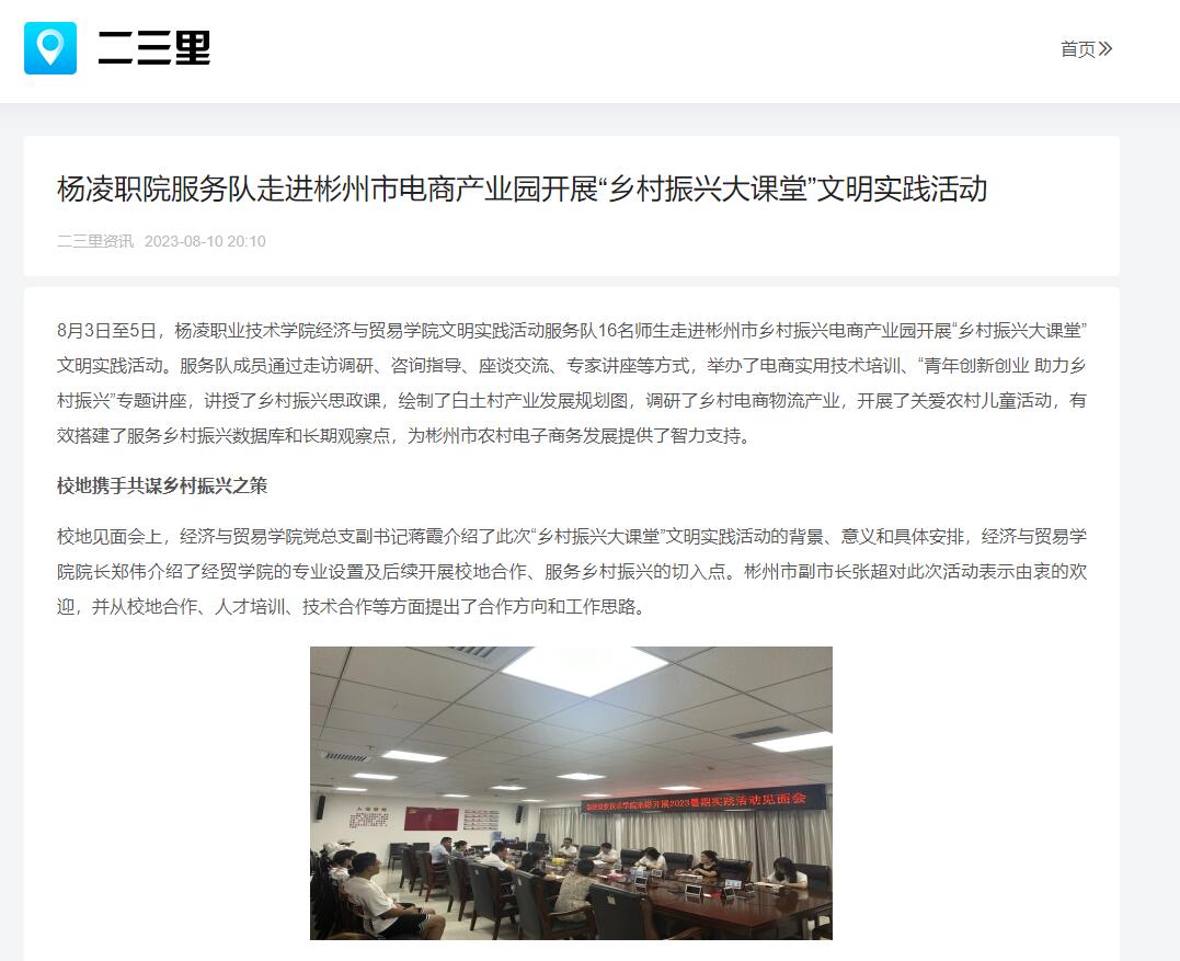 8月3日至5日,杨凌职业技术学院经济与贸易学院文明实践活动服务队16名师生走进彬州市乡村振兴电商产业园开展“乡村振兴大课堂”文明实践活动。服务队成员通过走访调研、咨询指导、座谈交流、专家讲座等方式,举办了电商实用技术培训、“青年创新创业 助力乡村振兴”专题讲座,讲授了乡村振兴思政课,绘制了白土村产业发展规划图,调研了乡村电商物流产业,开展了关爱农村儿童活动,有效搭建了服务乡村振兴数据库和长期观察点,为彬州市农村电子商务发展提供了智力支持。