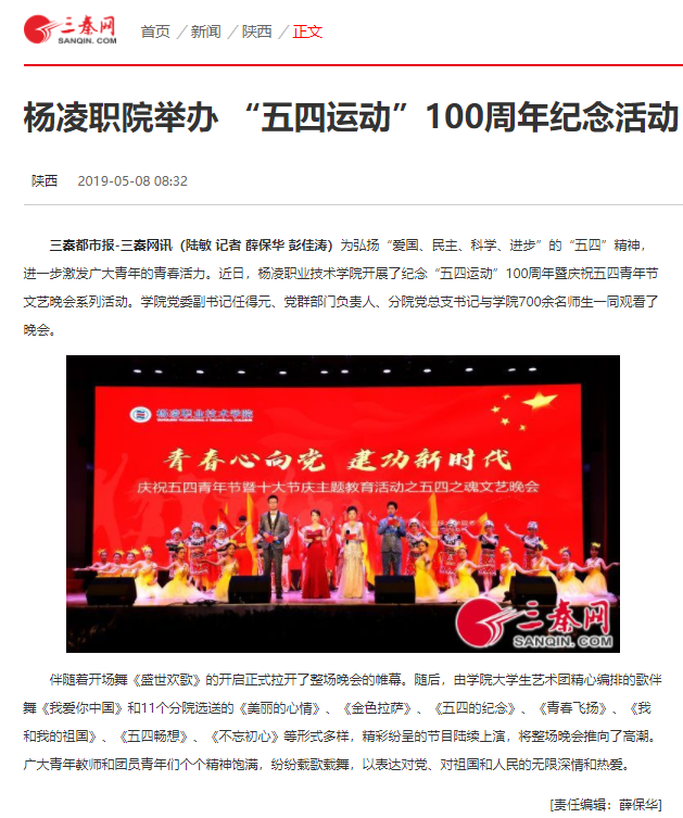 三秦都市报-三秦网讯(陆敏 记者 薛保华 彭佳涛)为弘扬“爱国、民主、科学、进步”的“五四”精神,进一步激发广大青年的青春活力。近日,杨凌职业技术学院开展了纪念“五四运动”100周年暨庆祝五四青年节文艺晚会系列活动。学院党委副书记任得元、党群部门负责人、分院党总支书记与学院700余名师生一同观看了晚会。