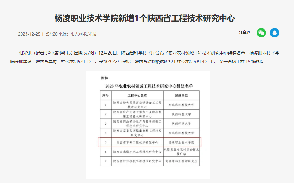 阳光讯(记者 赵小康 通讯员 崔晓 文/图)12月20日,陕西省科学技术厅公布了农业农村领域工程技术研究中心组建名单,杨凌职业技术学院获批建设“陕西省草莓工程技术研究中心”。是继2022年获批“陕西省动物疫病防控工程技术研究中心”后,又一省级工程中心获批。