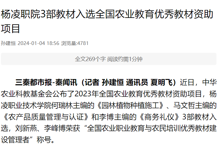 三秦都市报-秦闻讯(记者 孙建恒 通讯员 夏明飞)近日,中华农业科教基金会公布了2023年全国农业教育优秀教材资助项目,杨凌职业技术学院何瑞林主编的《园林植物种植施工》、马文哲主编的《农产品质量管理与认证》和李博主编的《商务礼仪》3部教材入选,刘新燕、李峰博荣获“全国农业职业教育与农民培训优秀教材建设管理者”称号。
