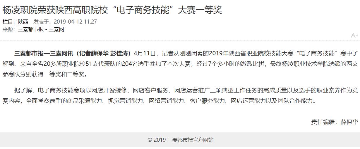 三秦都市报—三秦网讯(记者薛保华彭佳涛)4月11日,记者从刚刚闭幕的2019年陕西省职业院校技能大赛“电子商务技能”赛中了解到。来自全省20多所职业院校51支代表队的204名选手参加了本次大赛,经过7个多小时的激烈比拼,最终杨凌职业技术学院选派的两支参赛队分别获得一等奖和二等奖。
