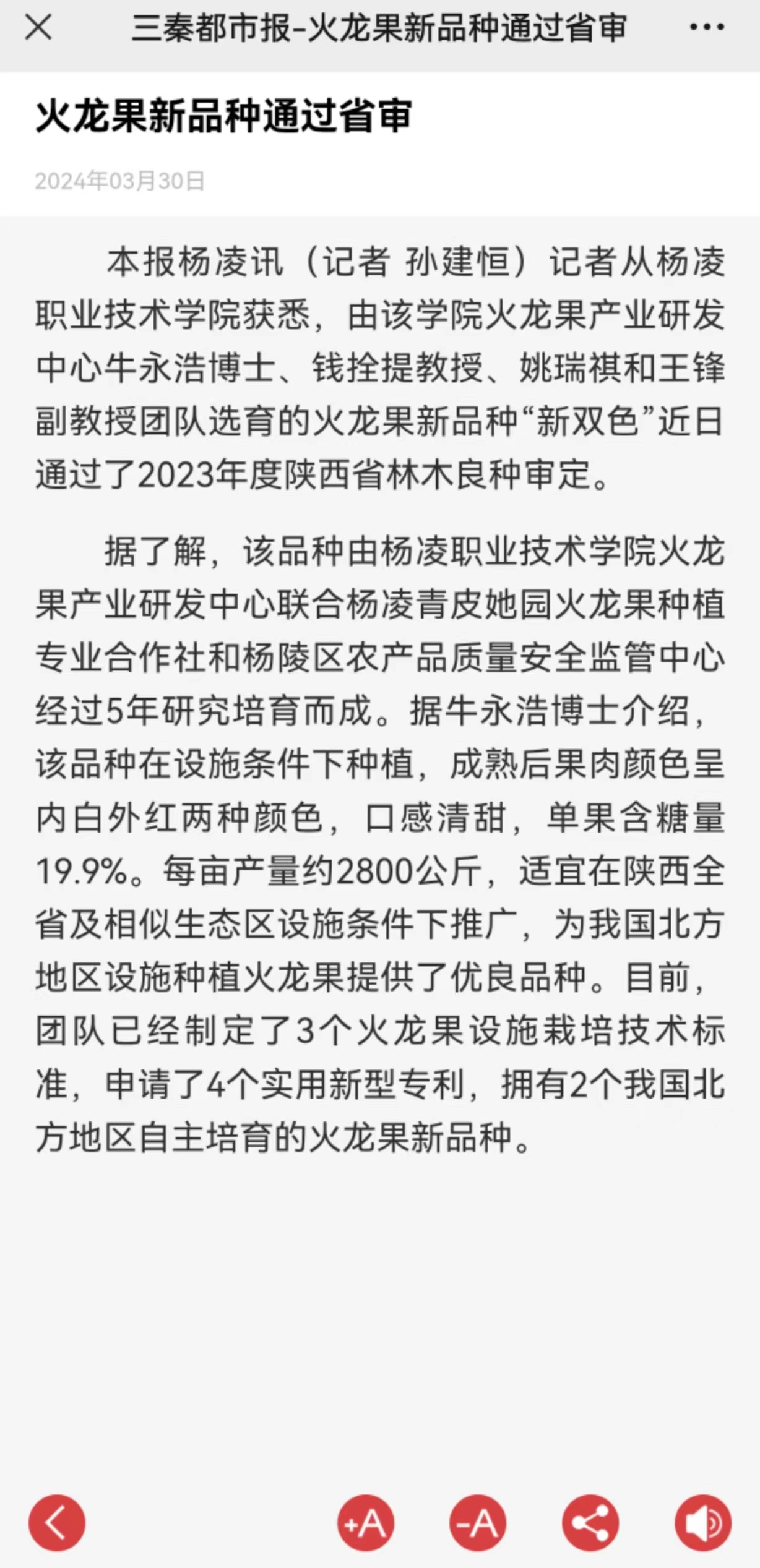 本报杨凌讯(记者 孙建恒)记者从杨凌职业技术学院获悉,由该学院火龙果产业研发中心牛永浩博士、钱拴提教授、姚瑞祺和王锋副教授团队选育的火龙果新品种“新双色”近日通过了2023年度陕西省林木良种审定。 据了解,该品种由杨凌职业技术学院火龙果产业研发中心联合杨凌青皮她园火龙果种植专业合作社和杨陵区农产品质量安全监管中心经过5年研究培育而成。据牛永浩博士介绍,该品种在设施条件下种植,成熟后果肉颜色呈内白外红两种颜色,口感清甜,单果含糖量19.9%。每亩产量约2800公斤,适宜在陕西全省及相似生态区设施条件下推广,为我国北方地区设施种植火龙果提供了优良品种。目前,团队已经制定了3个火龙果设施栽培技术标准,申请了4个实用新型专利,拥有2个我国北方地区自主培育的火龙果新品种。