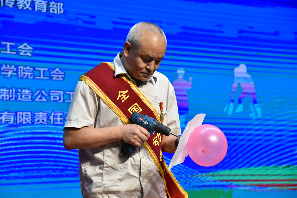 与此同时,为了让学生近距离接触劳模工匠,杨峰现场展示绝活绝技,用电钻在气球上给A4纸打孔,精湛的技艺引来现场师生阵阵掌声。任秀波则与师生热情交流互动,送上珠峰勘测专用纪念品和相关资料,并鼓励师生以劳动创造幸福,握紧接力棒,走好奋斗路。