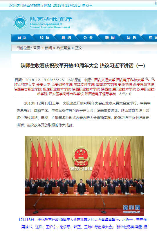 2018年12月18日上午,庆祝改革开放40周年大会在北京人民大会堂举行,中共中央总书记、国家主席、中央军委主席习近平在大会上发表重要讲话。陕西教育系统干部师生通过网络、电视、广播等多种形式收看收听大会直播实况,聆听习近平总书记重要讲话,热议改革开放取得的伟大成就。