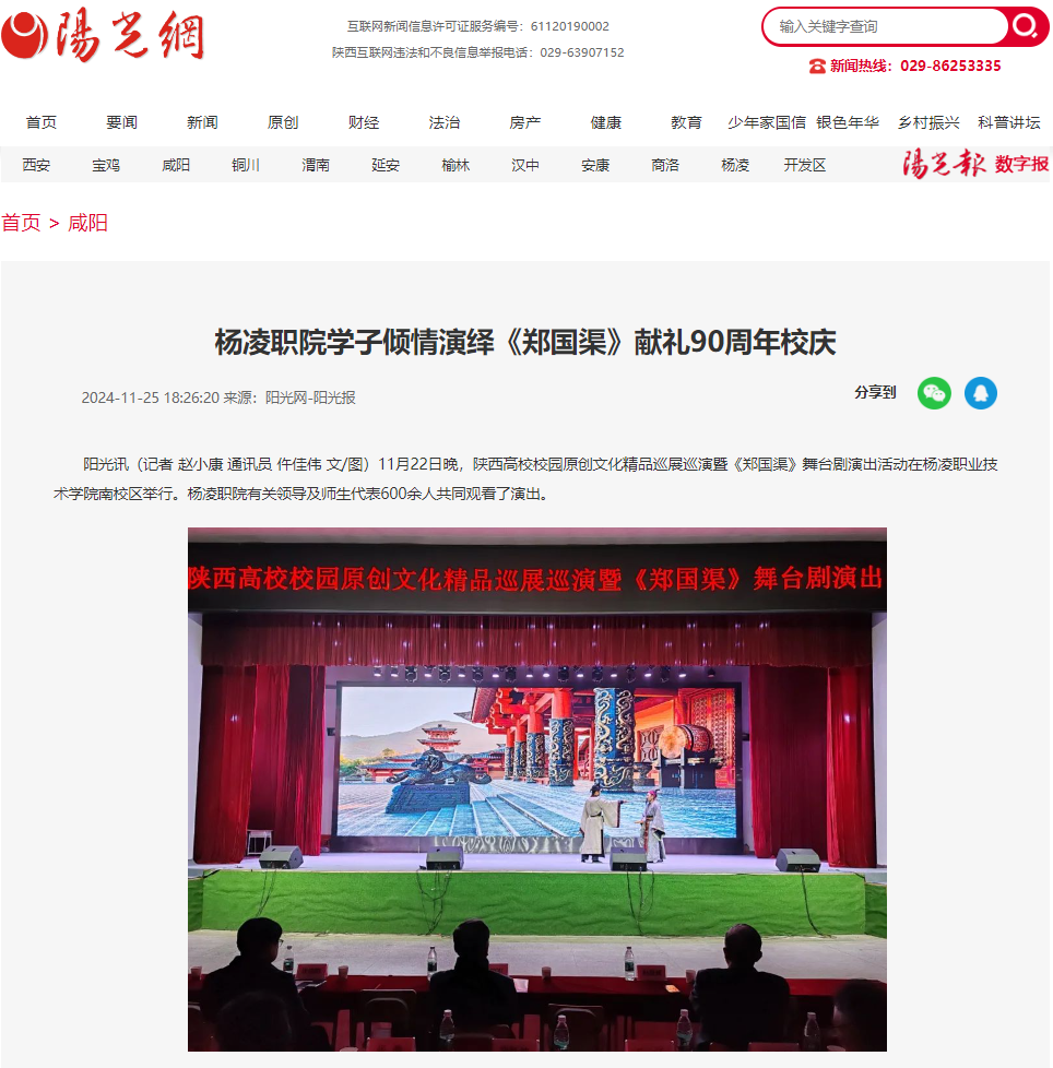 阳光讯(记者 赵小康 通讯员 仵佳伟 文/图)11月22日晚,陕西高校校园原创文化精品巡展巡演暨《郑国渠》舞台剧演出活动在杨凌职业技术学院南校区举行。杨凌职院有关领导及师生代表600余人共同观看了演出。
