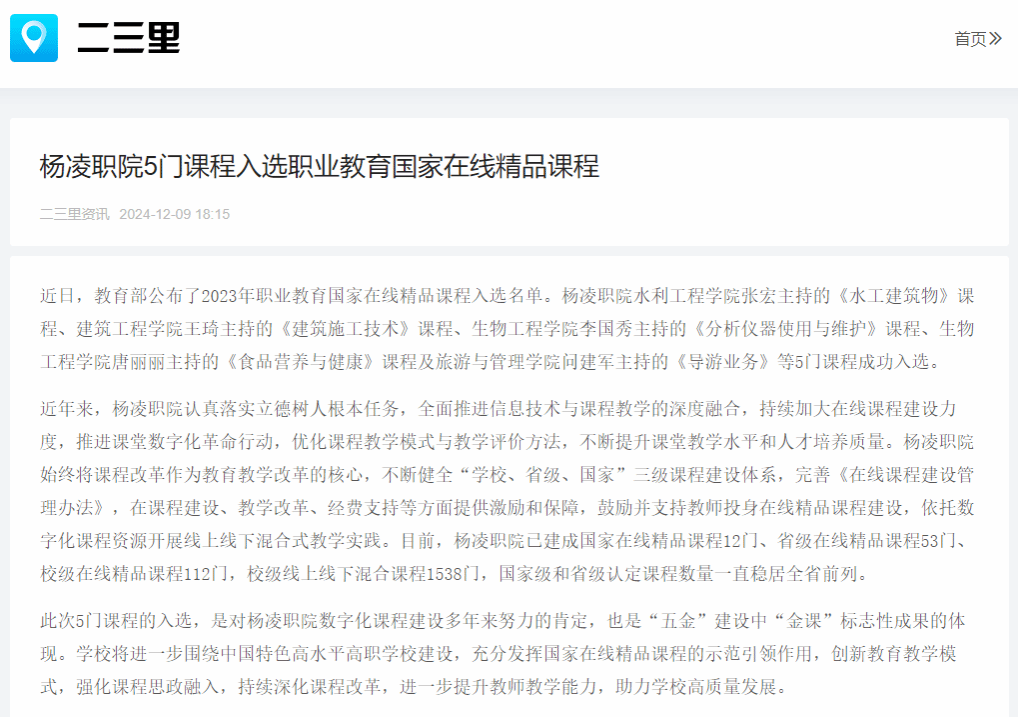 近日,教育部公布了2023年职业教育国家在线精品课程入选名单。杨凌职院水利工程学院张宏主持的《水工建筑物》课程、建筑工程学院王琦主持的《建筑施工技术》课程、生物工程学院李国秀主持的《分析仪器使用与维护》课程、生物工程学院唐丽丽主持的《食品营养与健康》课程及旅游与管理学院问建军主持的《导游业务》等5门课程成功入选。