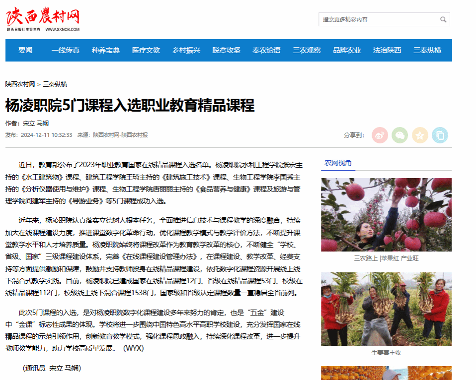 近日,教育部公布了2023年职业教育国家在线精品课程入选名单。杨凌职院水利工程学院张宏主持的《水工建筑物》课程、建筑工程学院王琦主持的《建筑施工技术》课程、生物工程学院李国秀主持的《分析仪器使用与维护》课程、生物工程学院唐丽丽主持的《食品营养与健康》课程及旅游与管理学院问建军主持的《导游业务》等5门课程成功入选。