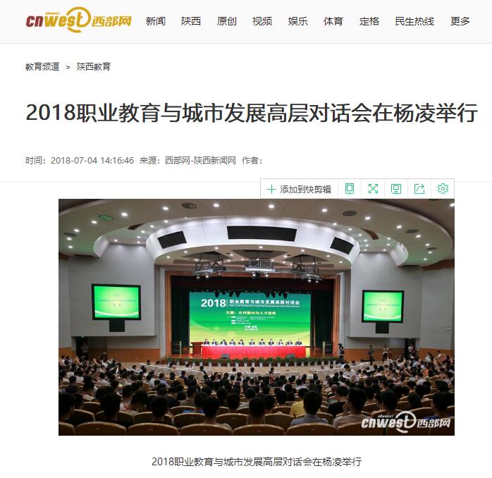 7月3日上午,由中华职业教育社、杨凌示范区管委会、陕西省教育厅、陕西中华职业教育社联合主办,杨凌职业技术学院承办,《职业与教育》杂志社协办的“2018职业教育与城市发展高层对话会”在杨凌开幕。