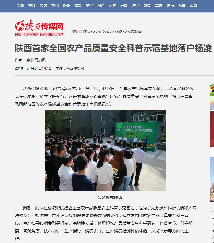 陕西传媒网讯 (记者 李蕊 实习生 马启凤)4月3日,全国农产品质量安全科普示范基地命名仪式在杨凌职业技术学院举行。这是我省成立的首家全国农产品质量安全科普示范基地,将为陕西省及西部地区的农产品质量安全科普示范作出积极贡献。