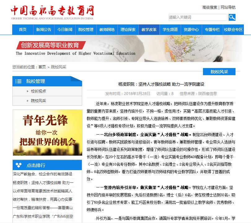 近年来,杨凌职业技术学院坚持人才强校战略,把师资队伍建设作为提升教育教学质量的重要内容来抓,坚持内培外引,不拘一格,柔性用才,实施“高层次高技能人才引进、教师能力提升、名师引领、专阿业带头人选拔培养、双师素质教师优化、兼职教师资源库建设”等6项人才强校专项计划,积极为建设一流学院提供人才支撑。