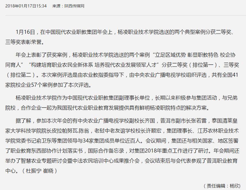 年会上表彰了获奖案例,杨凌职业技术学院选送的两个案例“立足区域优势 彰显职教特色 校企协同育人”“构建培育职业农民全新体系 培养现代农业发展领军人才”分获二等奖(排位第一)、三等奖(排位第二)。本次案例评选是由农业教指委指导下,由中央农业广播电视学校组织评选,共有全国41家院校企业57个案例参加了本次评选。