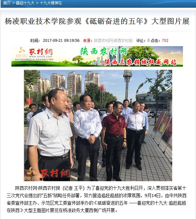 陕西农村网-陕西农村报 (记者 王平) 为了喜迎党的十九大胜利召开,深入贯彻落实省第十三次党代会提出的“五新”战略任务部署,努力营造追赶超越的浓厚氛围,9月14日,由中共陕西省委宣传部主办、示范区党工委宣传部承办的《砥砺奋进的五年 ——喜迎党的十九大 追赶超越在陕西》大型主题图片展览在杨凌政务大厦西侧广场开展。