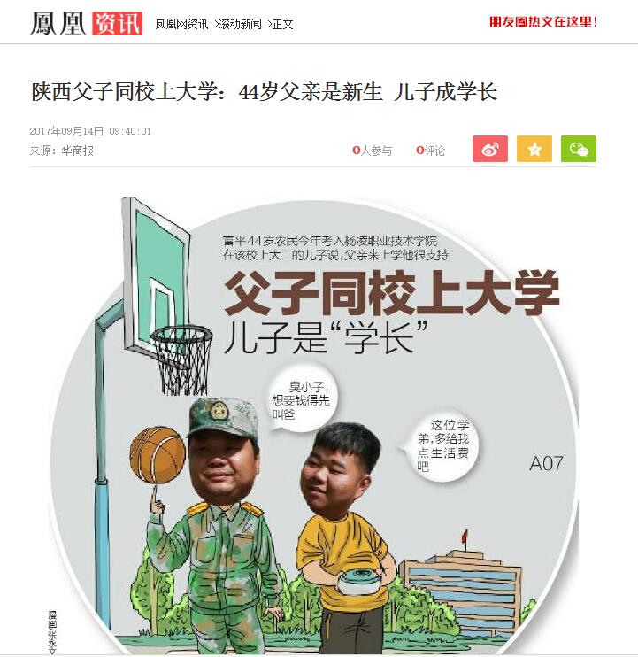 这个开学季,杨凌职业技术学院(简称杨凌职院)校园里有一对特殊的父子,父亲是今年考入该校的新生,儿子已经大二,算是父亲的“学长”了。