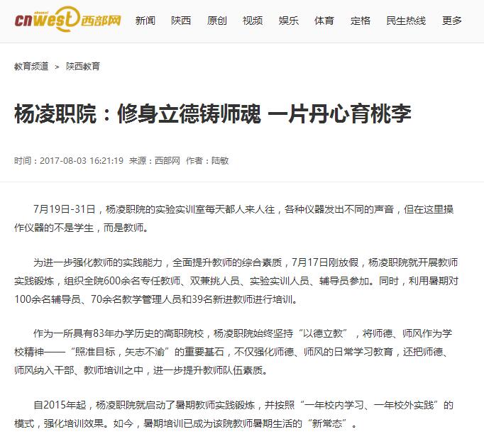 作为一所具有83年办学历史的高职院校,杨凌职院始终坚持“以德立教”,将师德、师风作为学校精神——“照准目标,矢志不渝”的重要基石,不仅强化师德、师风的日常学习教育,还把师德、师风纳入干部、教师培训之中,进一步提升教师队伍素质。