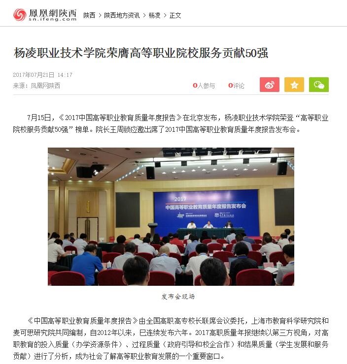 7月15日,《2017中国高等职业教育质量年度报告》在北京发布,杨凌职业技术学院荣登“高等职业院校服务贡献50强”榜单。院长王周锁应邀出席了2017中国高等职业教育质量年度报告发布会。