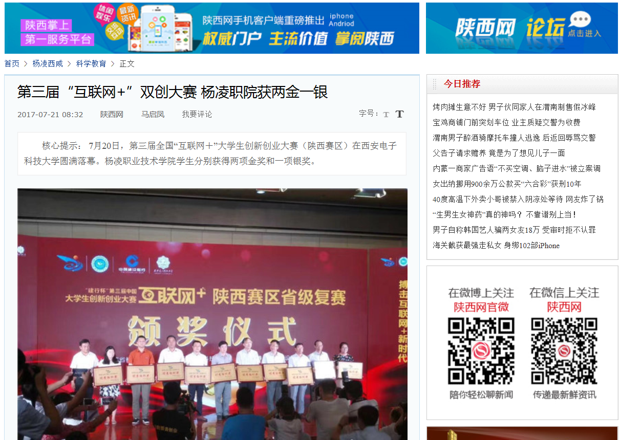 7月20日,第三届全国“互联网+”大学生创新创业大赛(陕西赛区)在西安电子科技大学圆满落幕。杨凌职业技术学院学生分别获得两项金奖和一项银奖。