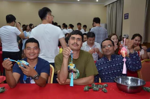 为了让前来我院参加培训学习的“一带一路”2017年发展中国家绵羊与山羊高效养殖培训班和肉牛奶牛生产综合技术培训班的56名外国朋友了解中国传统文化,欢度端午佳节。我院动物工程分院团总支组织了32名学生来到杨凌田园酒店二楼报告厅与外国友人举办了“忆端午·粽叶情,一带一路·一家亲”端午联谊活动。他们制作了图文并茂的ppt,向外国朋友讲述了中国端午节的由来和文化习俗,让外国友人感受中国传统文化的博大精深与无穷魅力。随后,32名学生分成8个小组为国际友人示范制作粽子的握粽叶、装米、放枣、裹粽叶、缠线等工艺流程,手把手的传授中国传统美食—粽子的制作技术。外国朋友们对包粽子充满了好奇,同学们耐心细致地教,外国朋友们对他们包出的生平第一个粽子,高兴地向“小师傅们”展示。来自蒙古的GANCHULUUN拿着自己亲手包的粽子说:“通过包粽子,让她知道了中国的端午节,知道了中国的伟大爱国主义诗人屈原,这是他参加的最有意义的活动之一”。为了巩固他们的制作技术,活动还设置了包粽子比赛环节,经过紧张的比赛,评选出了一、二、三等奖,在大家的欢呼声中,获奖选手上台领取了奖品—中国结。为了让国际友人品尝中国粽子的香甜,包粽子比赛结束后,同学们为每位外国朋友端上了预先准备好的粽子,蘸上蜂蜜,大家品尝着美食,纷纷竖起了大拇指。为了给外国朋友送上美好的端午祝福,同学们为每位朋友送上了美丽的香包,来自埃及的AYMAN GAMALF手捧漂亮的香包激动的说:“这是我收到的珍贵礼物,我会带回国内,好好珍藏。”