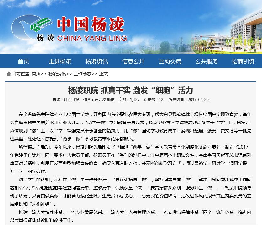 在全省率先免除建档立卡贫困生学费,开办国内首个职业农民大专班,帮太白县鹦鸽镇棉寺坝村贫困户实现致富梦,每年为青海玉树定向培养水利专业人才……“两学一做”学习教育开展以来,杨凌职业技术学院把着眼点聚焦于“学”上,把发力点体现到“做”上,以“学”增强党员干事创业的凝聚力,用“做”固化学习教育成果,涌现出赵瑜、张翼、贾文博等一批先进典型,处处让人感受到“两学一做”学习教育带来的浓郁新风。