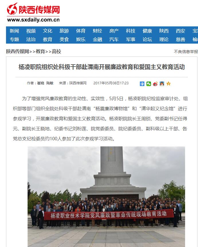 为了增强党风廉政教育的生动性、实效性,5月5日,杨凌职院纪检监察审计处、组织部等部门组织全院处科级干部赴渭南“杨震廉政博物馆”和“渭华起义纪念馆”进行参观学习,开展廉政教育和爱国主义教育活动。杨凌职院院长王周锁、党委副书记任得元、副院长王晓地、纪委书记刘粉莲、院党委委员、院纪委委员、副科级以上干部、各党总支纪检委员约100人参加了此次参观学习活动。