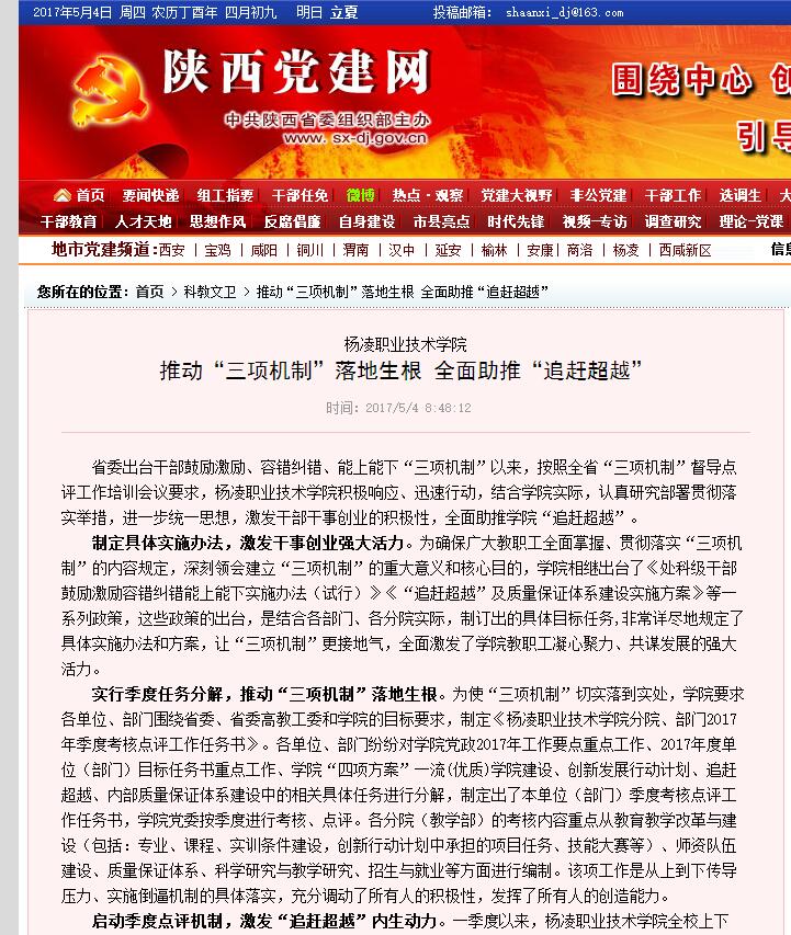 实行季度任务分解,推动“三项机制”落地生根。为使“三项机制”切实落到实处,学院要求各单位、部门围绕省委、省委高教工委和学院的目标要求,制定《杨凌职业技术学院分院、部门2017年季度考核点评工作任务书》。各单位、部门纷纷对学院党政2017年工作要点重点工作、2017年度单位(部门)目标任务书重点工作、学院“四项方案”一流(优质)学院建设、创新发展行动计划、追赶超越、内部质量保证体系建设中的相关具体任务进行分解,制定出了本单位(部门)季度考核点评工作任务书,学院党委按季度进行考核、点评。各分院(教学部)的考核内容重点从教育教学改革与建设(包括:专业、课程、实训条件建设,创新行动计划中承担的项目任务、技能大赛等)、师资队伍建设、质量保证体系、科学研究与教学研究、招生与就业等方面进行编制。该项工作是从上到下传导压力、实施倒逼机制的具体落实,充分调动了所有人的积极性,发挥了所有人的创造能力。