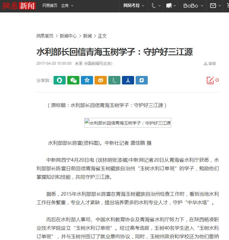 中新网西宁4月20日电 (谈林明张添福)中新网记者20日从青海省水利厅获悉,水利部部长陈雷日前回信青海省玉树藏族自治州“玉树水利订单班”的学子,勉励他们掌握知识和技能,共同守护三江源。