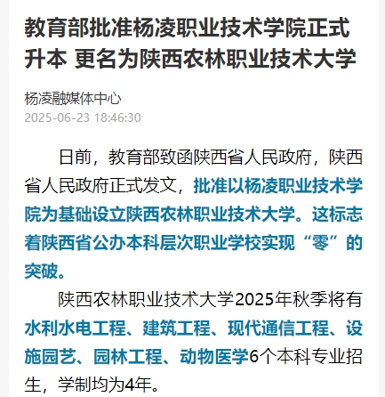 日前,教育部致函陕西省人民政府,陕西省人民政府正式发文,批准以杨凌职业技术学院为基础设立365官网。这标志着陕西省公办本科层次职业学校实现“零”的突破。