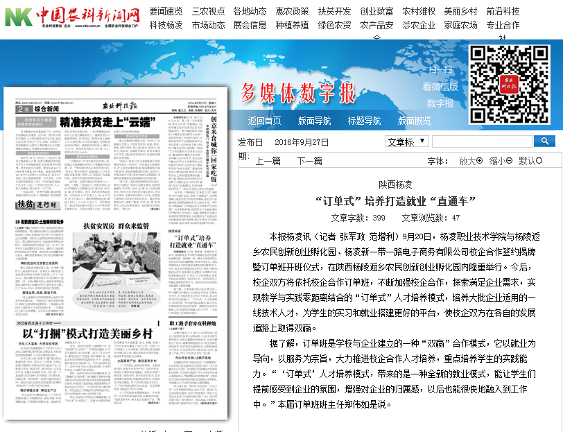 本报杨凌讯(记者 张军政 范增利)9月20日,杨凌职业技术学院与杨陵返乡农民创新创业孵化园、杨凌新一带一路电子商务有限公司校企合作签约揭牌暨订单班开班仪式,在陕西杨陵返乡农民创新创业孵化园内隆重举行。今后,校企双方将依托校企合作订单班,不断加强校企合作,探索满足企业需求,实现教学与实践零距离结合的“订单式”人才培养模式,培养大批企业适用的一线技术人才,为学生的实习和就业搭建更好的平台,使校企双方在各自的发展道路上取得双赢。 据了解,订单班是学校与企业建立的一种“双赢”合作模式,它以就业为导向,以服务为宗旨,大力推进校企合作人才培养,重点培养学生的实践能力。“‘订单式’人才培养模式,带来的是一种全新的就业模式,能让学生们提前感受到企业的氛围,增强对企业的归属感,以后也能很快地融入到工作中。”本届订单班班主任郑伟如是说。