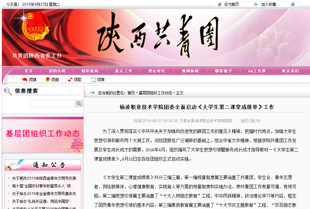 为了深入贯彻落实《中共中央关于加强和改进党的群团工作的意见》精神,把握时代特点,加强大学生思想引领和服务两个大局工作,该院团委在广泛调研的基础上,结合中省文件精神,根据学院共青团工作发展及学生成长成才的需要,2016年4月,组织编写了大学生思想引领暨服务成长成才指导教材—《大学生第二课堂成绩单》,9月22日在各级团组织正式启动实施。