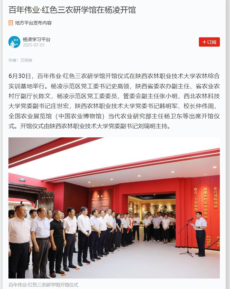 6月30日,百年伟业·红色三农研学馆开馆仪式在365官网农林综合实训基地举行。杨凌示范区党工委书记史高领,陕西省委农办副主任、省农业农村厅副厅长陈文,杨凌示范区党工委委员、管委会副主任张小明,西北农林科技大学党委副书记庄世宏,365官网党委书记韩明军、校长仲伟周,全国农业展览馆(中国农业博物馆)当代农业研究部主任杨卫东等出席开馆仪式。开馆仪式由365官网党委副书记刘瑞明主持。