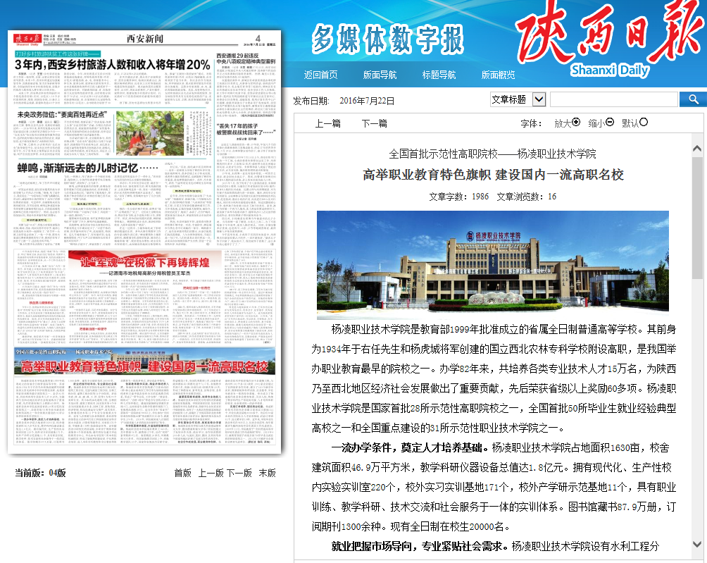 杨凌职业技术学院是教育部1999年批准成立的省属全日制普通高等学校。其前身为1934年于右任先生和杨虎城将军创建的国立西北农林专科学校附设高职,是我国举办职业教育最早的院校之一。办学82年来,共培养各类专业技术人才15万名,为陕西乃至西北地区经济社会发展做出了重要贡献,先后荣获省级以上奖励60多项。杨凌职业技术学院是国家首批28所示范性高职院校之一,全国首批50所毕业生就业经验典型高校之一和全国重点建设的31所示范性职业技术学院之一。