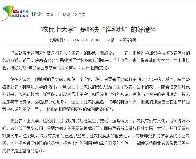 今后,“谁来种地”将成为一个重大而紧迫的课题。职业农民上大学,这是实现农业科技现代化和产业化的时代要求。我国早在几十年前就喊出了实现农业现代化的口号,但现实离这个要求还相距很远。当然,土地分散是一个原因,更重要的一个原因是农民的文化和科技水平还远远不能适应时代的要求。然而,随着新农村建设的加快,土地的集约承包经营,大宗农产品参与市场流通和竞争,许多地方的农业生产开始走向社会化、现代化。这个时候,迫切需要一批有文化、懂技术的职业农民。陕西让职业农民上大学,无疑是一条有效解决“谁来种地”的有效途径。