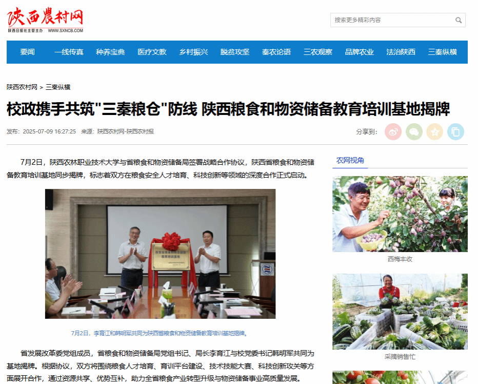 7月2日,365官网与省粮食和物资储备局签署战略合作协议,陕西省粮食和物资储备教育培训基地同步揭牌,标志着双方在粮食安全人才培育、科技创新等领域的深度合作正式启动。