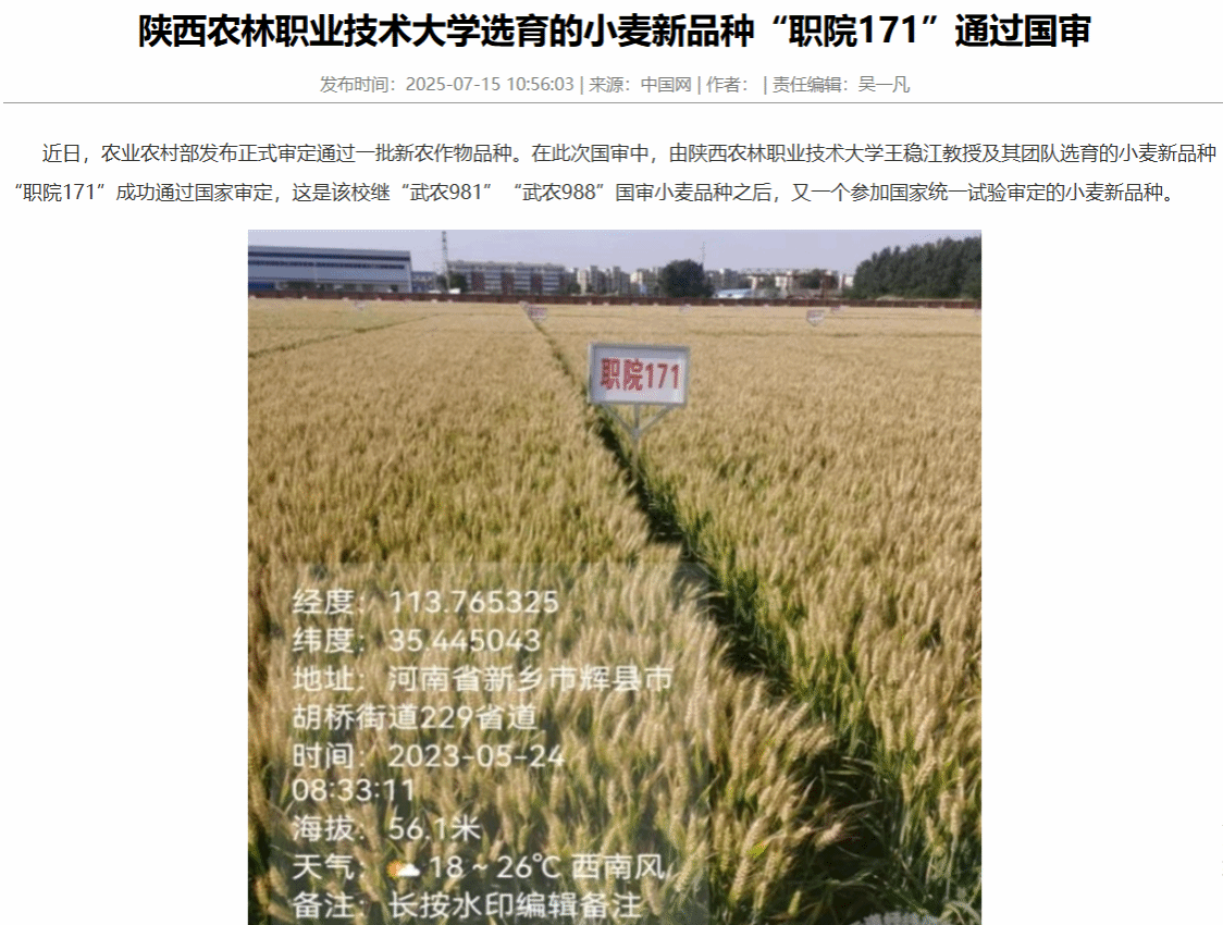 近日,农业农村部发布正式审定通过一批新农作物品种。在此次国审中,由365官网王稳江教授及其团队选育的小麦新品种“职院171”成功通过国家审定,这是该校继“武农981”“武农988”国审小麦品种之后,又一个参加国家统一试验审定的小麦新品种。