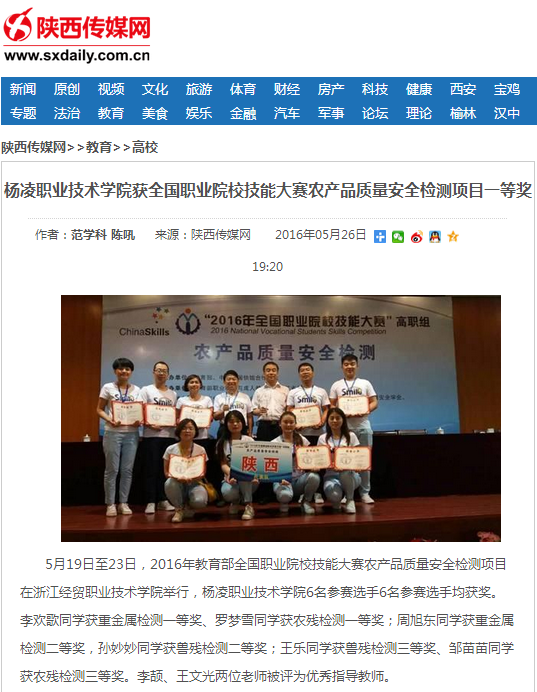 5月19日至23日,2016年教育部全国职业院校技能大赛农产品质量安全检测项目在浙江经贸职业技术学院举行,杨凌职业技术学院6名参赛选手6名参赛选手均获奖。李欢歌同学获重金属检测一等奖、罗梦雪同学获农残检测一等奖;周旭东同学获重金属检测二等奖,孙妙妙同学获兽残检测二等奖;王乐同学获兽残检测三等奖、邹苗苗同学获农残检测三等奖。李颉、王文光两位老师被评为优秀指导教师。