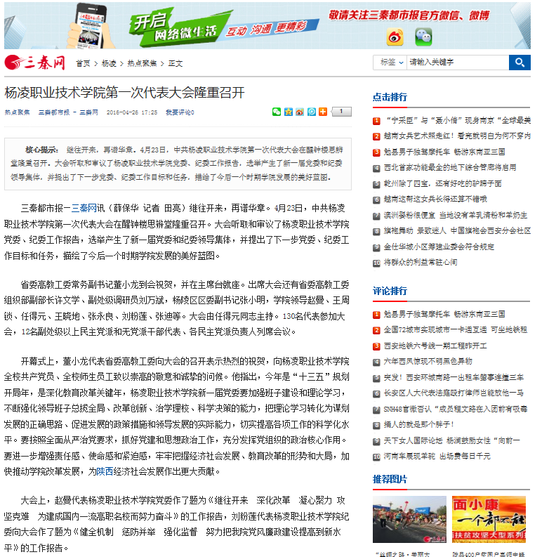 【三秦网】杨凌职业技术学院第一次代表大会隆重召开