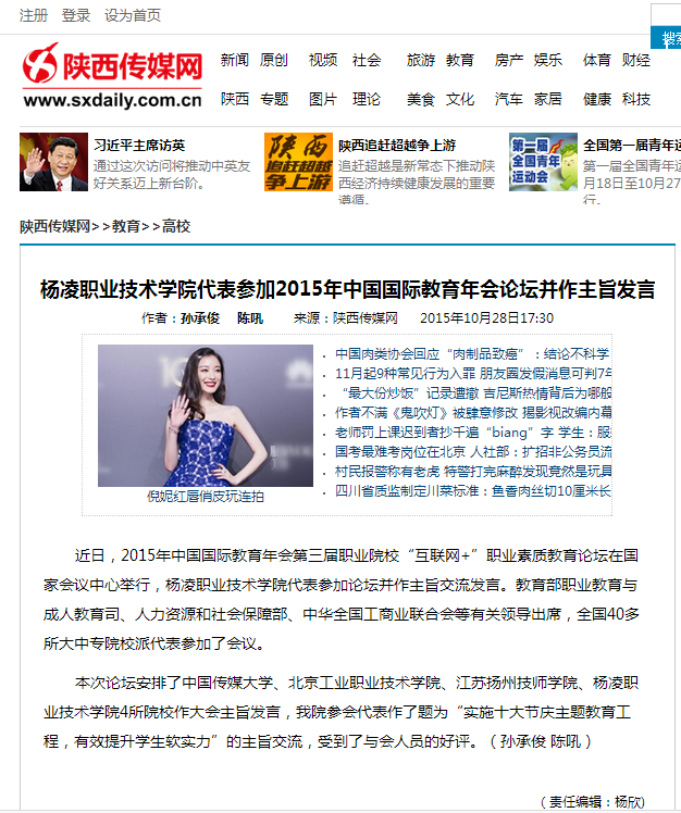 近日,2015年中国国际教育年会第三届职业院校“互联网+”职业素质教育论坛在国家会议中心举行,杨凌职业技术学院代表参加论坛并作主旨交流发言。教育部职业教育与成人教育司、人力资源和社会保障部、中华全国工商业联合会等有关领导出席,全国40多所大中专院校派代表参加了会议。
