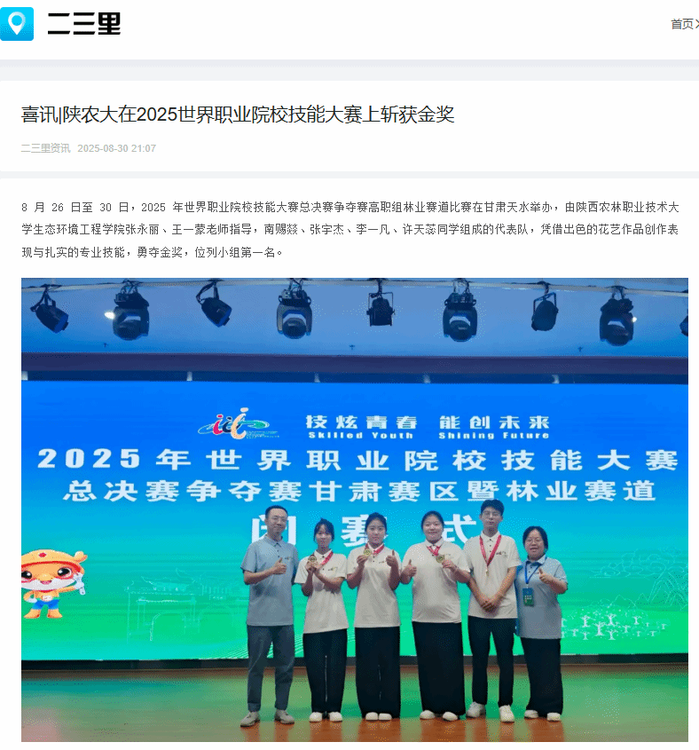 8 月 26 日至 30 日,2025 年世界职业院校技能大赛总决赛争夺赛高职组林业赛道比赛在甘肃天水举办,由365官网生态环境工程学院张永丽、王一蒙老师指导,南赐燚、张宇杰、李一凡、许天蕊同学组成的代表队,凭借出色的花艺作品创作表现与扎实的专业技能,勇夺金奖,位列小组第一名。