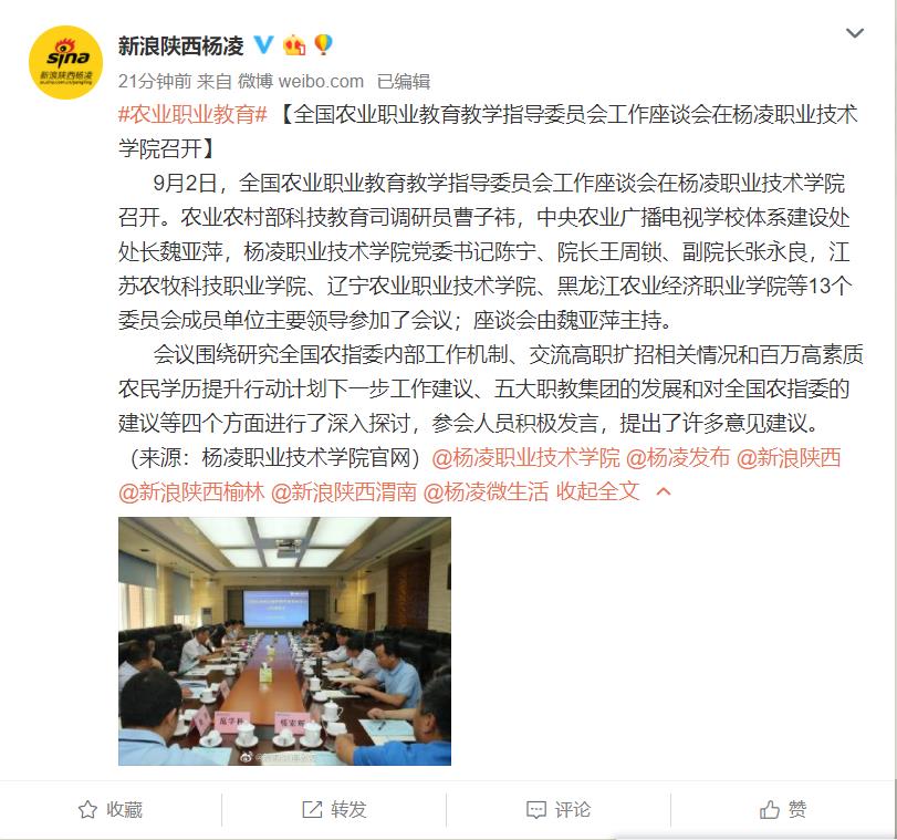 9月2日,全国农业职业教育教学指导委员会工作座谈会在杨凌职业技术学院召开。农业农村部科技教育司调研员曹子祎,中央农业广播电视学校体系建设处处长魏亚萍,杨凌职业技术学院党委书记陈宁、院长王周锁、副院长张永良,江苏农牧科技职业学院、辽宁农业职业技术学院、黑龙江农业经济职业学院等13个委员会成员单位主要领导参加了会议;座谈会由魏亚萍主持。