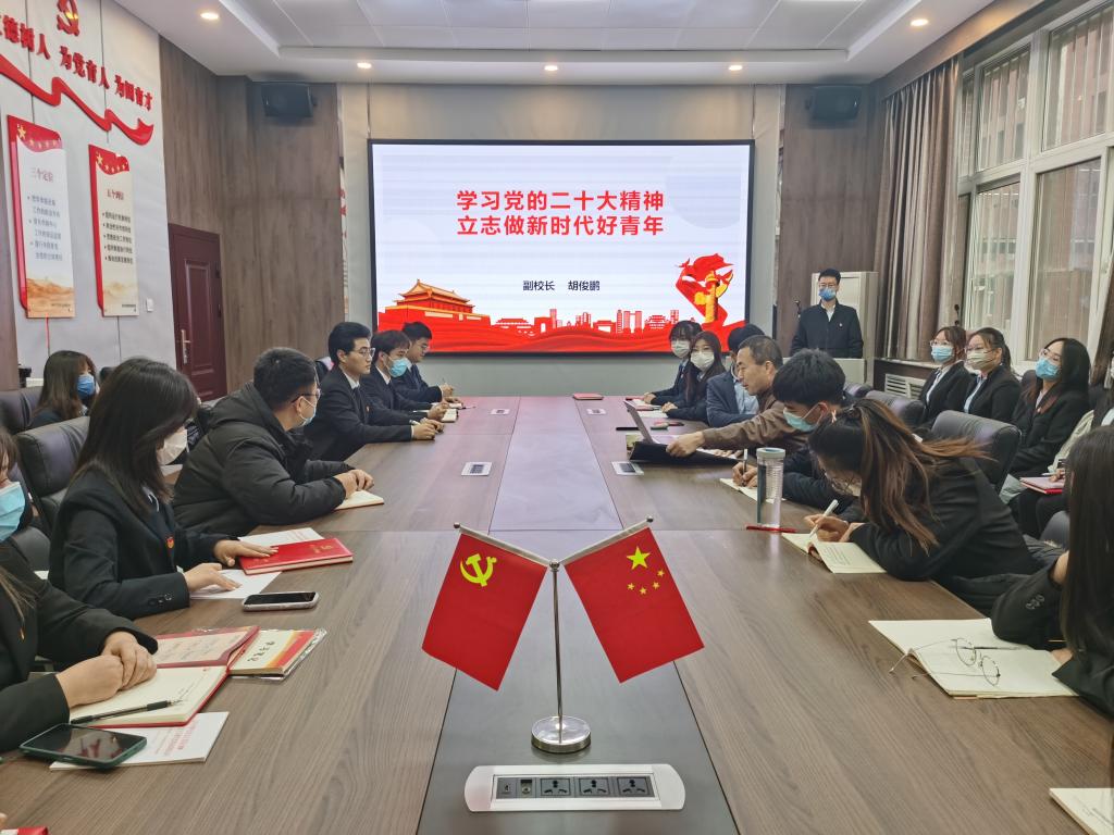 11月29日下午,副校长胡俊鹏在北校区行知楼为旅游与管理学院学生党员宣讲党的二十大精神。